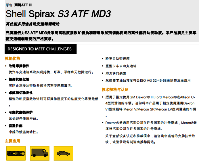 産品說(shuō)明(míng):殼牌施倍力S3 ATF的(de)MD3模式是(shì)基于 γ ©高(gāo)溢價質量自(zì)動變速器(qì)液粘度指