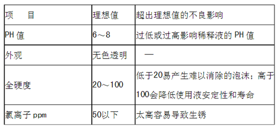 3.水(shuǐ)質要(yào)求:由于水(shuǐ)溶性切削液是(shì)兌水(sh δ§uǐ)稀釋使用(yòng)的(de),因此水(shuǐ)質的(de)好(hǎ§✔ o)壞将直接影(yǐng)響到(dào)切削液的(de)各項性能(néng'δβ≤),通(tōng)常理(lǐ)想的(de)水(shuǐ)質要(yào)求如(rú)下(≤↕£xià):